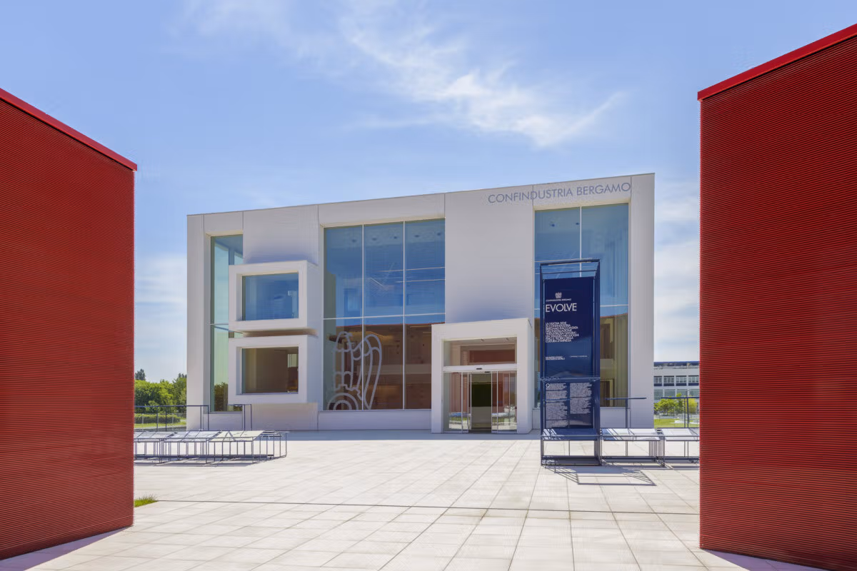 Realizzato nel “Parco Scientifico Tecnologico Kilometro Rosso”, l’edificio si caratterizza da una superficie di 6.500 mq, quattro piani fuori terra, un auditorium da 260 posti e serre bioclimatiche.