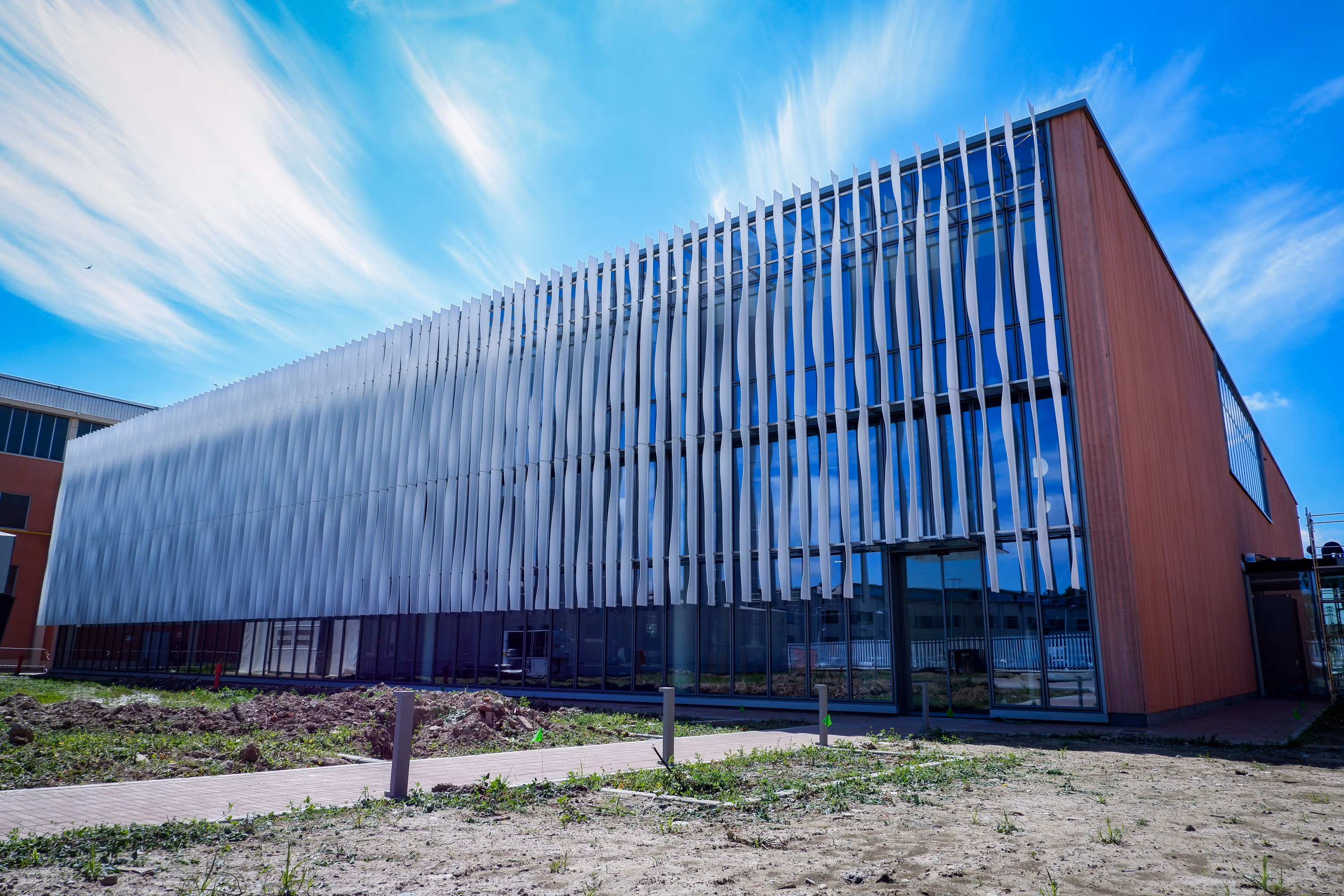 È un volume semplice e compatto, che ottimizza gli aspetti energetici e funzionali e scopre un giardino sospeso, sul quale si affacciano al primo piano gli uffici e tutte le sale prova.
